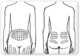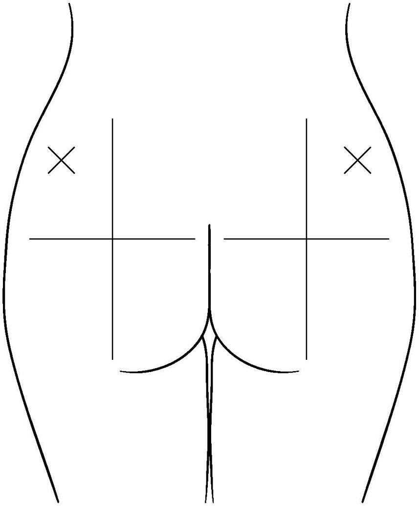 Para saber qual o local exato da aplicação da injeção intramuscular no glúteo deve-se dividir o glúteo em 4 partes iguais e colocar 3 dedos, na diagonal, no quadrante superior direito, junto à interseção das linhas imaginárias, como mostra a primeira Desta forma é possível evitar ferir o nervo ciático que pode causar